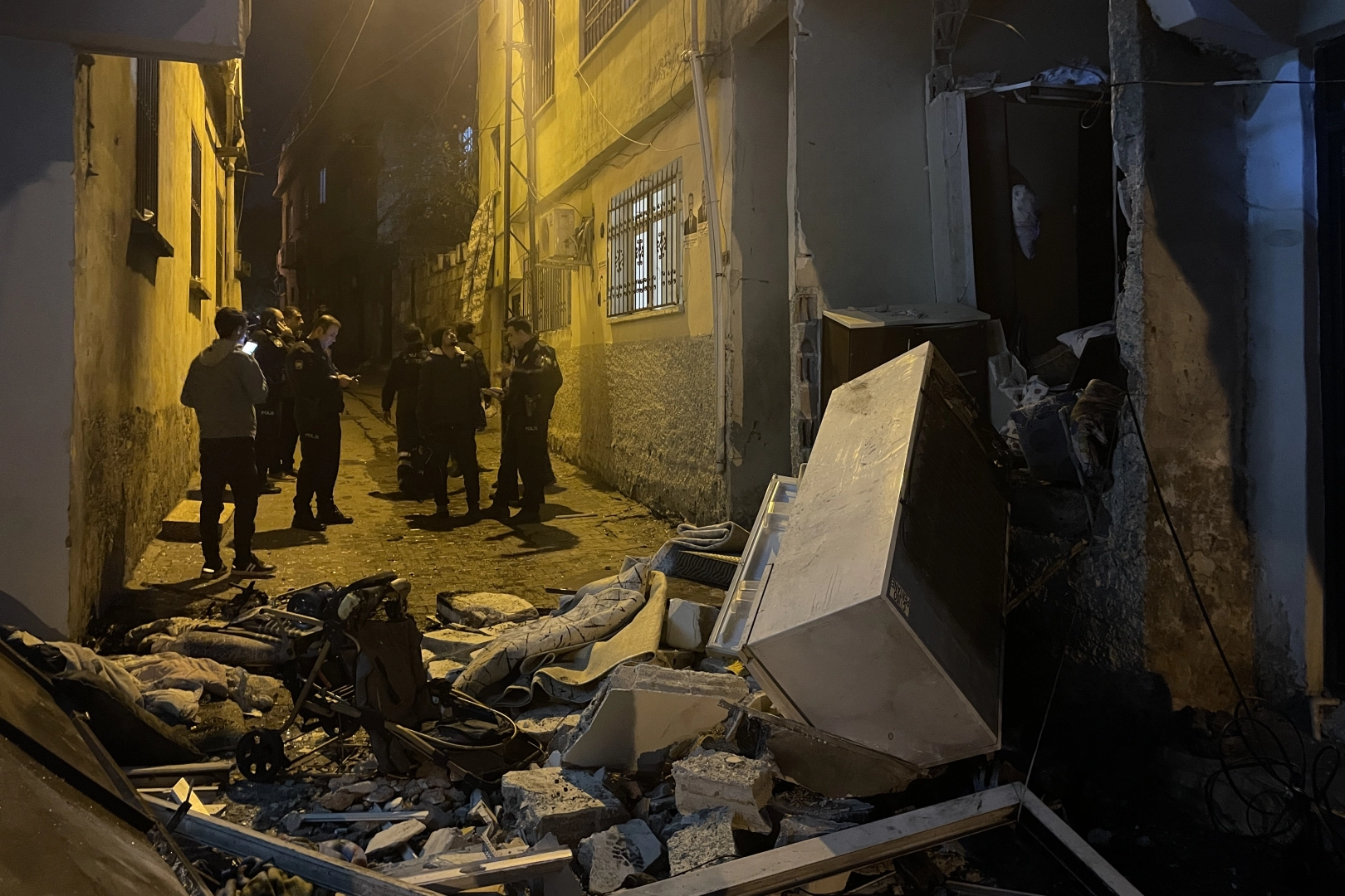 Patlama sonucu, sokağa bakan dış duvarının yıkılmasıyla eşyalar dışarı savruldu, evde büyük hasar oluştu.