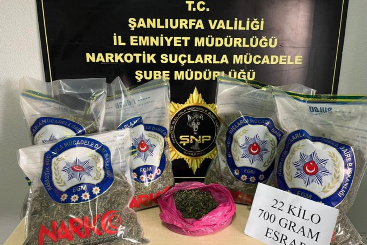 Şanlıurfa'nın Suruç ilçesinde 22 kilo 700 gram esrar ele geçirildi, 2 şüpheli gözaltına alındı.