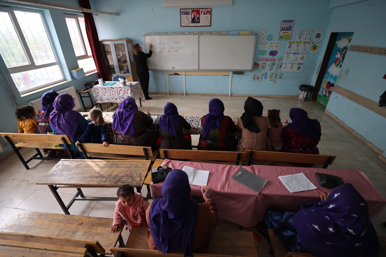 Eğitim saati içerisinde çocuklara harfleri öğreten öğretmenler, okul saatinin tamamlanmasının ardından aynı harfleri mahalledeki kadınlara öğretmek için ikinci bir sınıf kuruyor.