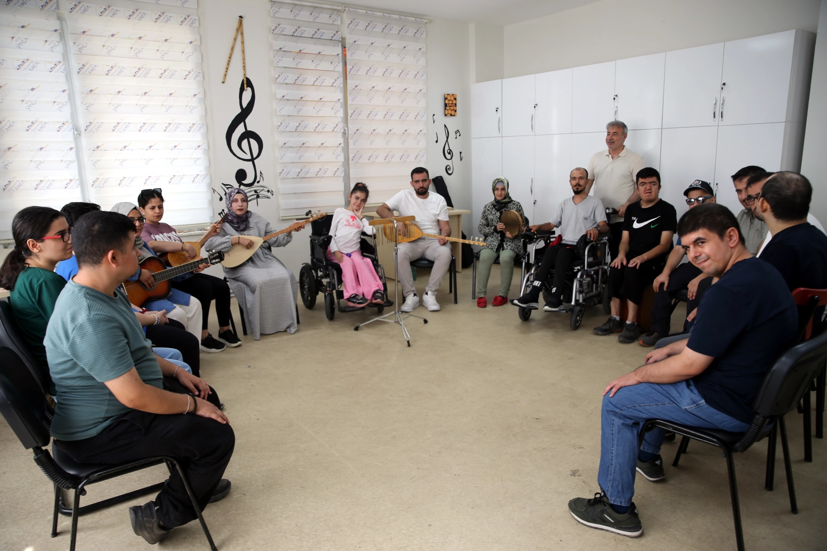 Şanlıurfa Büyükşehir Belediyesi Engelliler Koordinasyon Merkezi'nde açılan müzik kursuna katılan 30 kursiyer, müzik eğitmeni Sedat Volkan nezaretinde melodiler eşliğinde güzel vakit geçiriyor.
