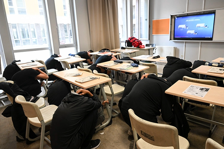 MEB AKUB üyeleri, öğrencilere deprem öncesinde ve esnasında yapılması gerekenlere ilişkin bilgilendirmede bulundu, ardından gerçekleştirilen tatbikatta, öğrenciler siren uyarısıyla çök-kapan-tutun tekniğini uyguladı.