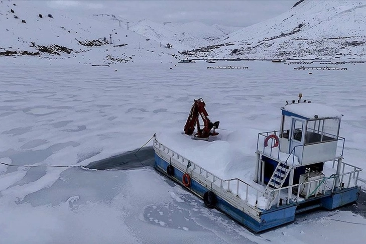 Barajdaki tekne, alabalık kafesleri ve yüzen adaların donması fotoğraf tutkunları ve doğaseverler için güzel manzaralar oluşturdu.