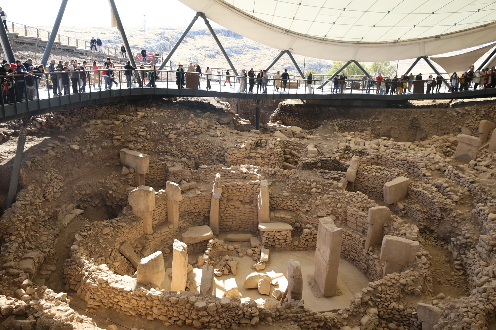 Kazılarda neolitik döneme ait, boyları 3 ila 6 metre, ağırlıkları 40 ila 60 ton olan, yabani hayvan figürlü "T" biçimli dikili taşlar bulundu. Ayrıca 8 ila 30 metre çapında dairesel ve dikdörtgen şekilli, dünyanın en eski tapınak kalıntıları ve yaklaşık 12 bin yıl öncesine ait olduğu belirtilen 65 santimetre uzunluğunda insan heykeli gibi çeşitli eserler gün yüzüne çıkarıldı.