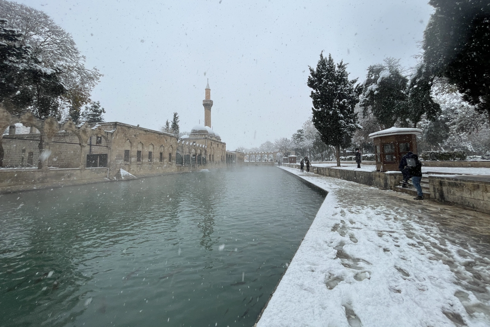 Kentte gece saatlerinde başlayan kar yağışı, tarihi Balıklıgöl ve Şanlıurfa Kalesi'ni beyaza bürüdü.