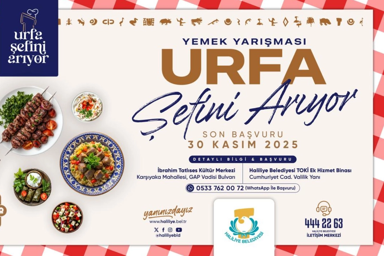 Haliliye Belediyesi, yöresel tatların yaşatılması ve gastronomi turizmine katkı sunulması amacıyla “Urfa Şefini Arıyor” adlı yemek yarışmasını düzenliyor. Başvurular, 30 Kasım’a kadar uzatıldı.