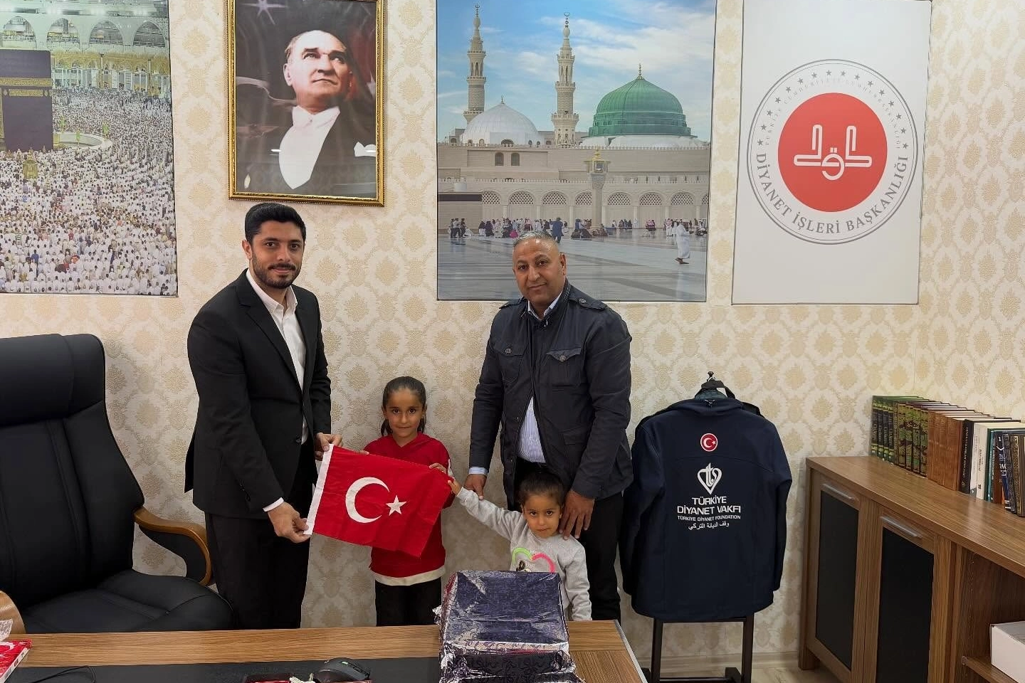 Müftü Ertürk, Debe ailesini ve çocukları Dilek ile Reyhan'ı makamında misafir etti, çocuklara çeşitli hediyeler takdim etti.