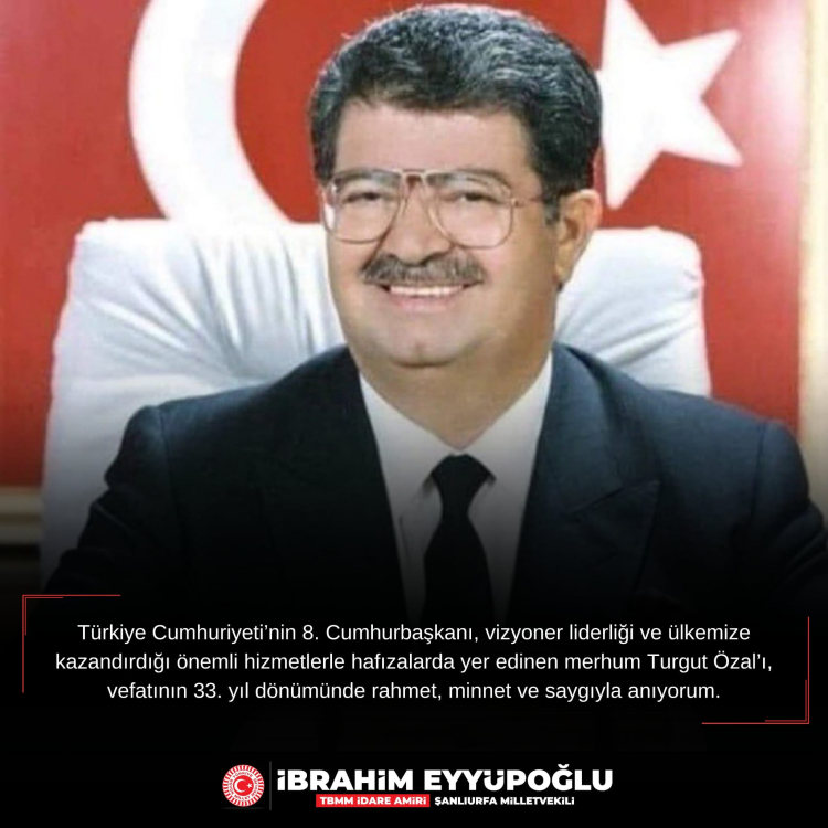 TBMM İdare Amiri Ak Parti Şanlıurfa Milletvekili Avukat İbrahim Eyyüpoğlu sosyal medya hesabından yaptığı açıklama ile 8. Cumhurbaşkanı Turgut Özal’ı andı.