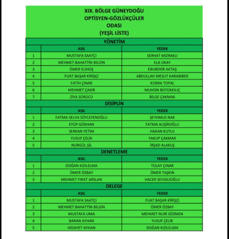 XIX Bölge Güneydoğu Optisyen Gözlükçüler Odası yapılan seçimli olağanüstü genel kurulda Yeşil Liste olarak seçime giren Mustafa Saatçı ve ekibi yoğun bir katılım ile gerçekleşen seçimde güven tazeleyerek yeniden başkan seçildi.
