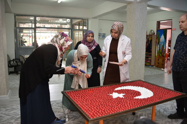 Bahçelievler Mahallesi'ndeki Kırkbir Evler Anaokulu öğretmeni Şevin Utli, anne atölye çalışmaları kapsamında velilerle atık malzemelerden Türk bayrağı yapmak istedi.