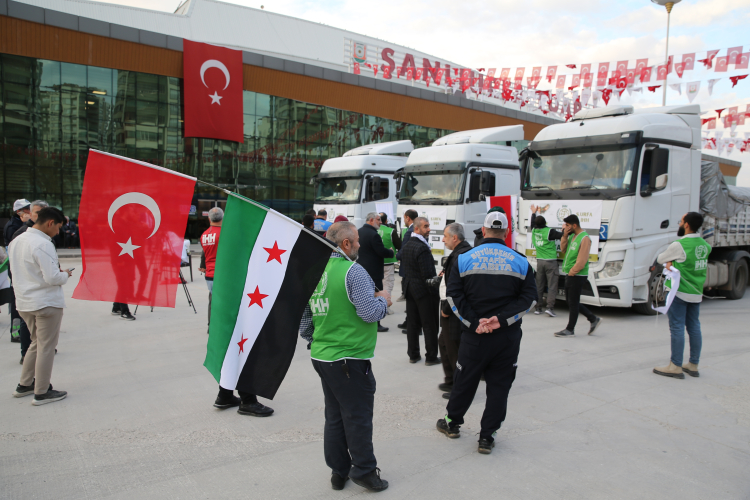 Şanlıurfa Fuar Merkezinde toplanan yardımlar tırlara yüklenerek, Suriye'ye törenle uğurlandı.