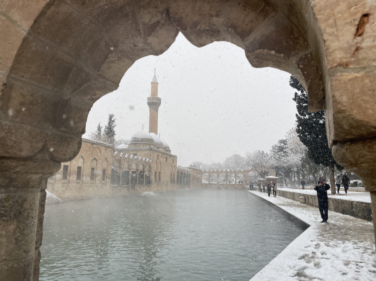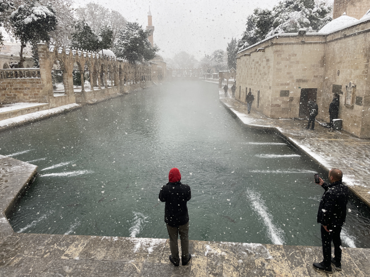 Kentte gece saatlerinde başlayan kar yağışı, tarihi Balıklıgöl ve Şanlıurfa Kalesi'ni beyaza bürüdü.