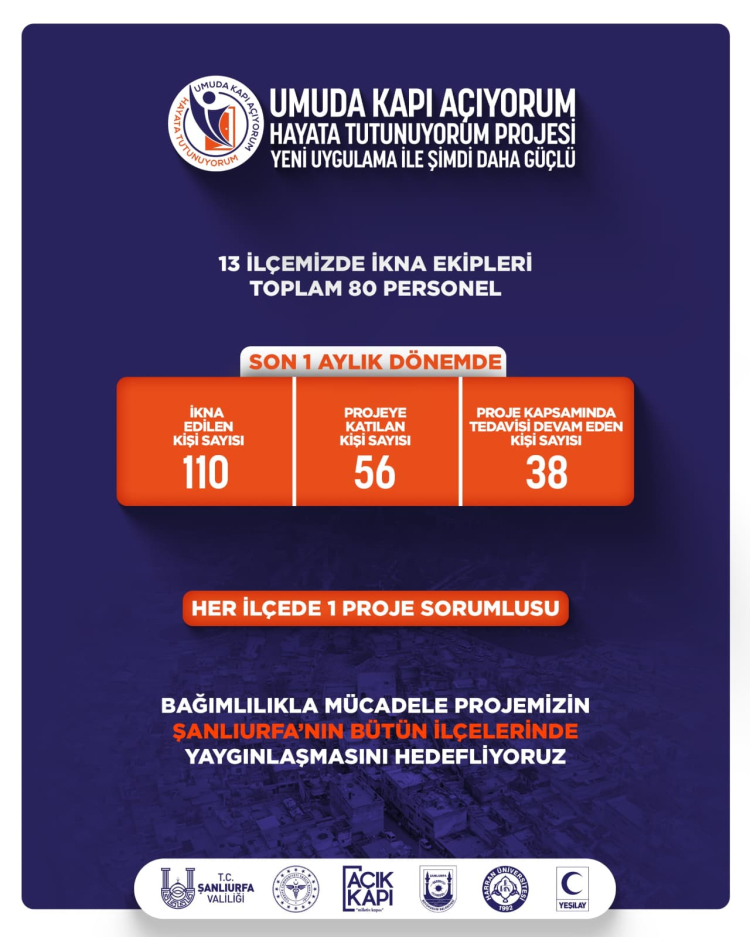 Şanlıurfa’da bağımlılıkla mücadele çalışmaları yeni bir uygulamayla güçlendirildi. Şanlıurfa Valisi Hasan Şıldak, “Umuda Kapı Açıyorum Hayata Tutunuyorum Projesi” kapsamında tüm ilçelerde “İkna Ekipleri” oluşturulduğunu açıkladı.
